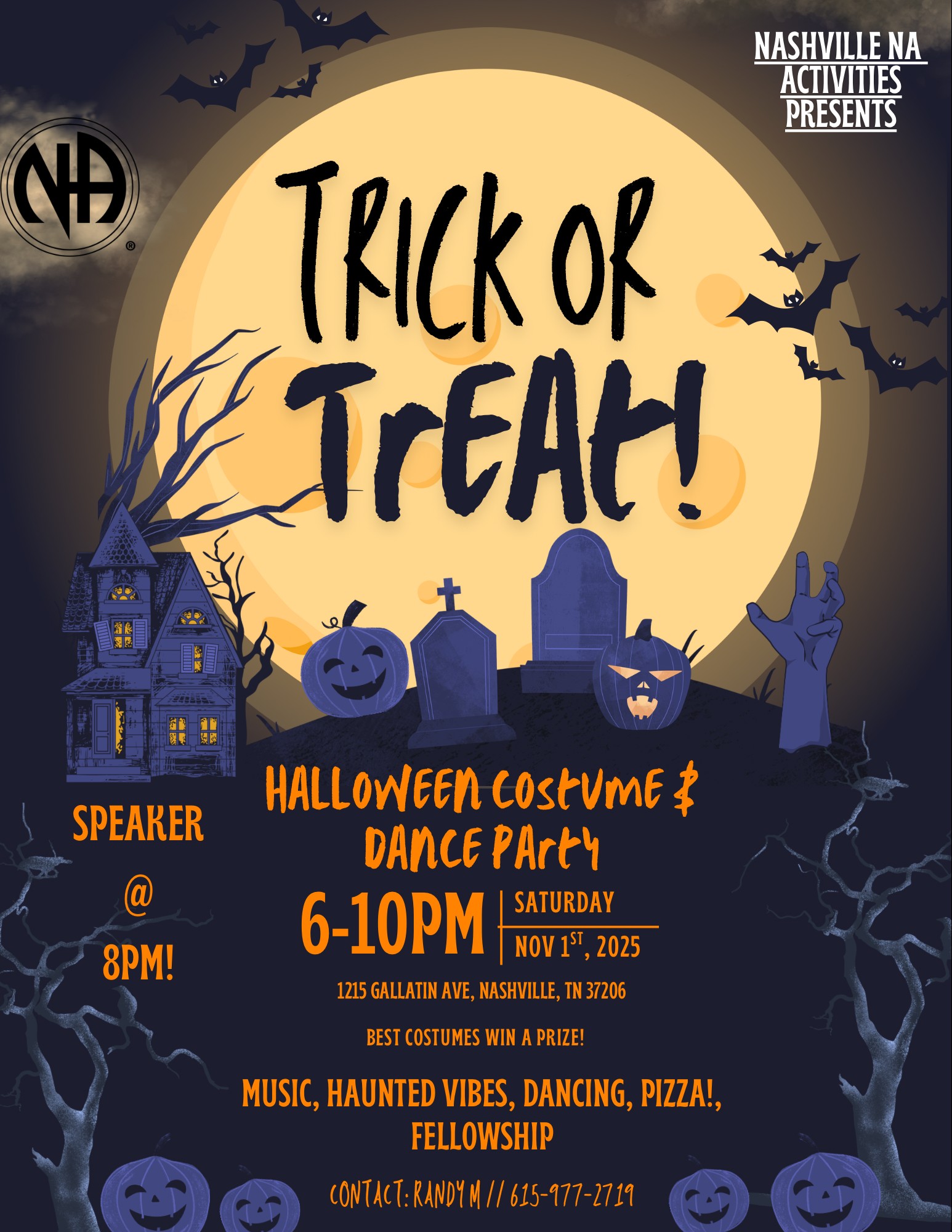 6-10pm, Saturday Nov 1, 2025 1215 Gallatin Ave, Nashville, TN 37026 (where Easy Does It meets) Best costumes win a prize Music, Haunted Vibes, Dancing, Pizza, Fellowship Speaker @ 8pm