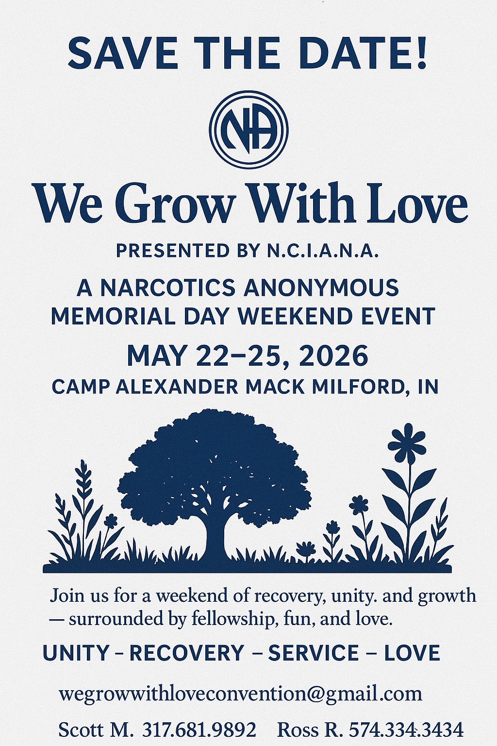 Presented by North Central Indiana Area of NA Memorial Day Weekend Event Camp Alexander Mack Milford, IN Please note: starting and ending times are estimates. Please use the contact info on the flyer
