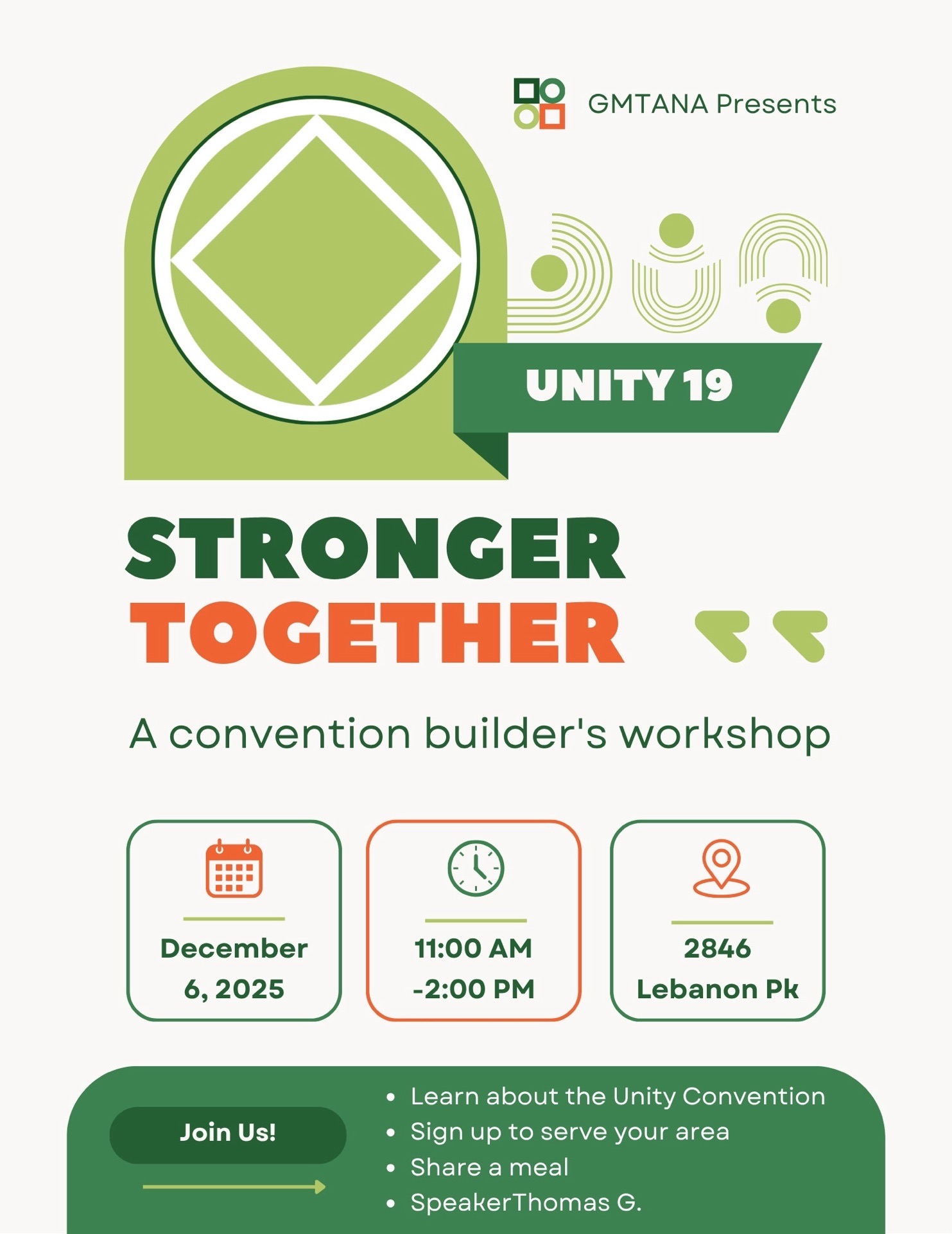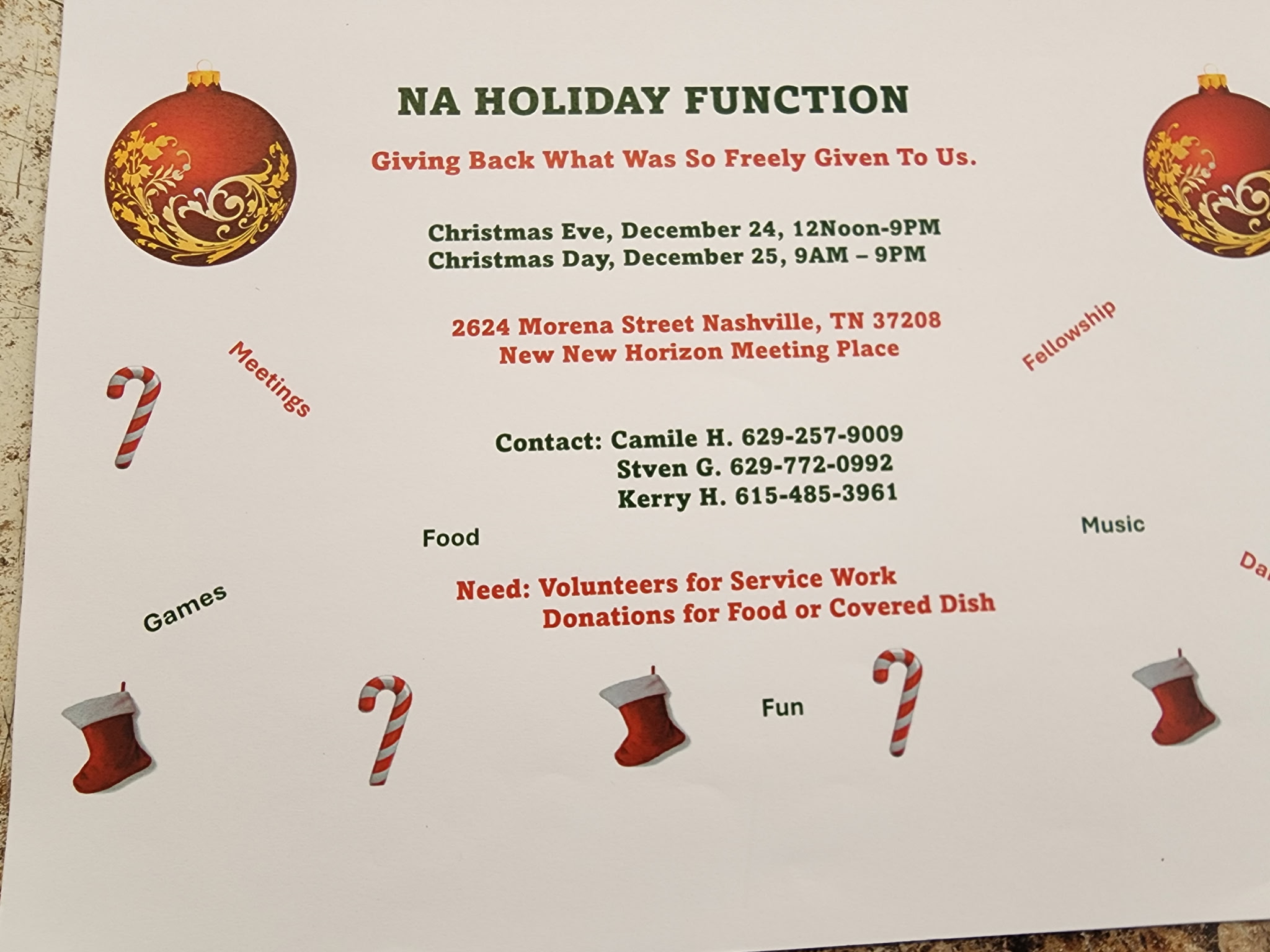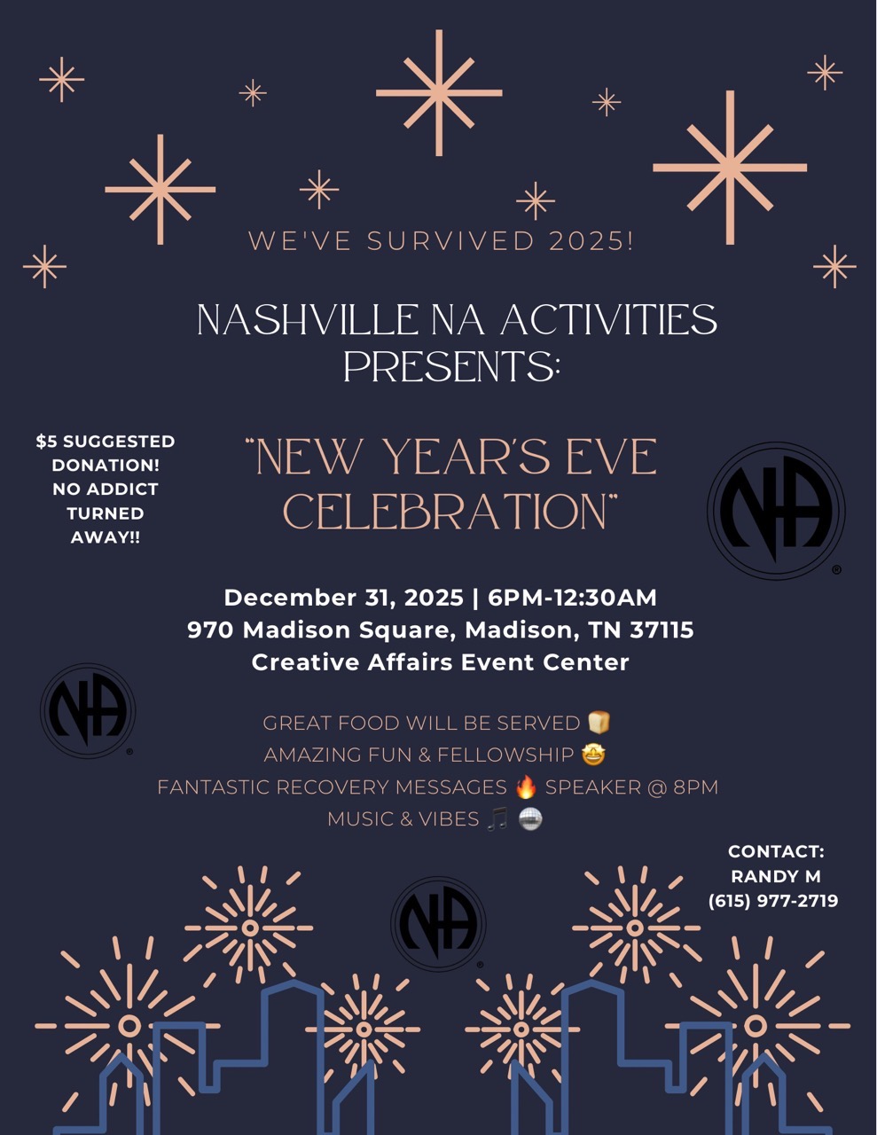 We survived 2025! 12/31/2025 6pm-12:30am Creative Affairs Event Center, 970 Madison Square, Madison, TN 37115 Food, Fun, Fellowship, Music & Vibes Speaker @ 8pm $5 suggested donation (no addict turned away) Contact: Randy M. 615-977-2719