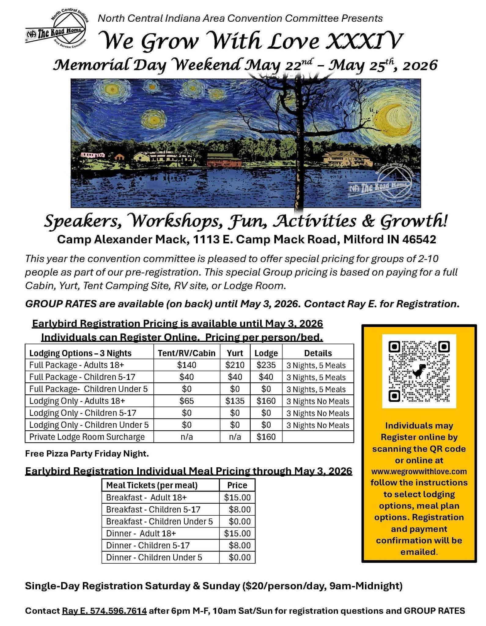 Presented by North Central Indiana Area Camp Alexander Mack, 1113 E. Camp Mack Road, Milford, IN 46542 May 22-25, 2026