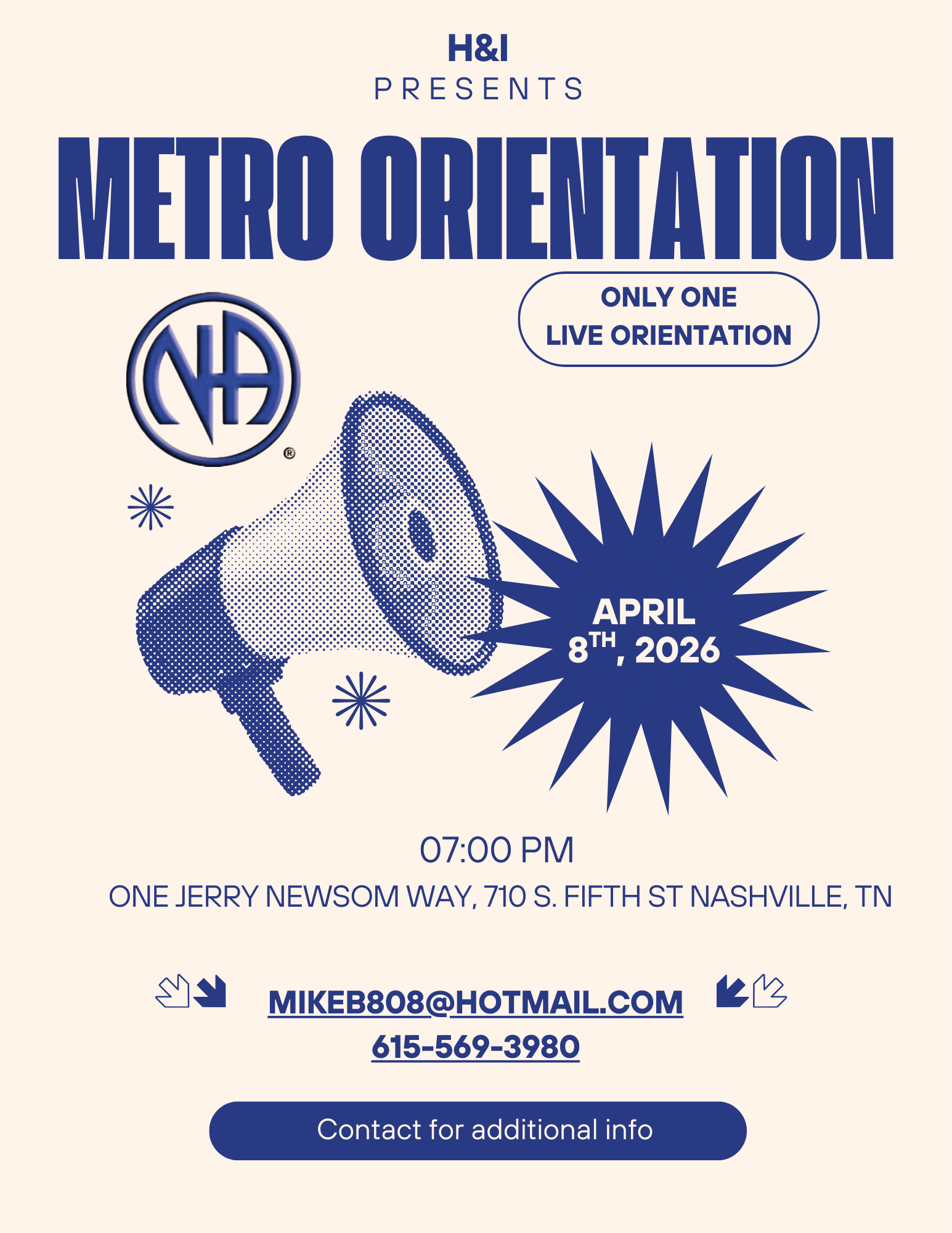 Orientation for those interested in participating in H&I at Metro Nashville Jails Only live orientation April 8, 2026 @ 7pm One Jerry Newsom Way, 710 S. Fifth St, Nashville, TN Contact Mike B @